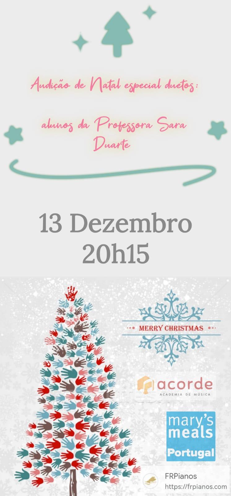 O dia 13 de dezembro foi muito especial graças a generosa e talentosa professora de Piano Sara Duarte que organizou com todo o carinho e amizade a Audição de Natal de duetos, foi sem dúvida um final de tarde muito bem passado com muita melodia!